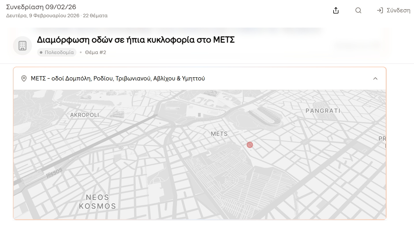 Για παράδειγμα, στη συζήτηση σχετικά με την ανακατασκευή οδών ήπιας κυκλοφορίας στο Μετς (από την οδό Τριβωνιανού ως την οδό Αρχιμήδους), συμμετείχε ο πρόεδρος του συλλόγου Αρδηττός, μιας ενεργής ομάδας πολιτών που ασχολούνται με τα ζητήματα της γειτονιάς τους τακτικά. Στην προκειμένη περίπτωση, εξέφρασαν τον προβληματισμό τους σχετικά με την υλοποίηση του προγράμματος στο σύνολό του ή αν θα μείνει σε μια πιλοτική υλοποίηση που έχει -προφορικά- υποσχεθεί να χρηματοδοτήσει το ίδρυμα Ωνάση (το οποίο φέρεται να έχει στην κατοχή του ορισμένα ακίνητα στους προτεραιοποιημένους δρόμους).
